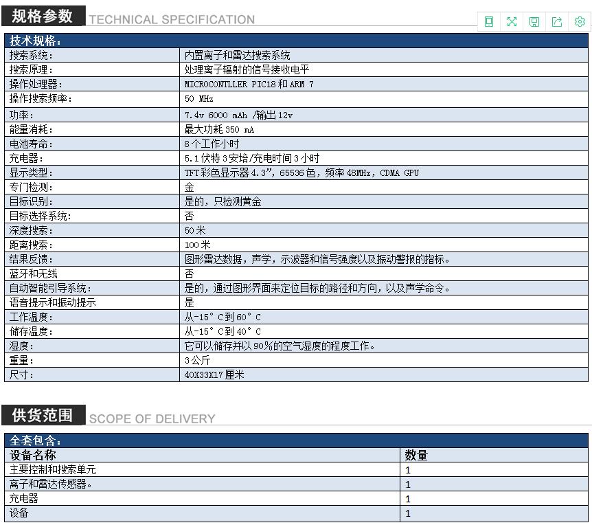 内置电离层和雷达探测系统探测地下黄金。 黄金雷达:黄金探测和勘探设备领域的新科学创新,黄金雷达是多次试验和长期研究的结果,持续了三年多。 黄金雷达装置工作在一个已建立的雷达探测系统上,用于探测和搜索埋在地下的黄金的放射性电离。 该设备通过专业的控制界面在智能操作和检测系统上工作,同时还支持多种优势和特性,使其成为全球首款同类产品最好的仪器,该装置向用户提供可靠的声学结果和图形雷达和屏幕上的可见结果到目标的方向,并且通过声音和图形指示器的水平的增加。它还绘制雷达屏幕上的目标站点并定位方向,通过雷达探测系统的高浓度和检测目标站点的能力,并用非常清晰和完整的目标数据引导用户。 黄金雷达是处理软件中最简单的设备之一,是目标位置检测中速度最快,最准确的设备。 分类:声学检测系统,黄金探测器,电离层和雷达搜索系统,远程定位系统 标签:金,金探测器,响应速度 一般特征: 1、智能雷达系统具有高精度和性能的检测和搜索技术。 2、金雷达是一款智能探测器,具有现代化的操作和探测技术,可以探测和搜索埋藏在地下的金子。 3、专门从事黄金检测的离子和雷达检测设备领域的新型尖端科学创新。 4、TFT彩色触摸屏3.2英寸高清,让用户在夜间和白天清晰的视觉。 该设备为用户提供了多个结果,包括以下内容: 1、雷达检测系统通过先进的雷达检测接口。 2、在雷达屏幕上绘制目标的点和位置。 3、通过在屏幕系统上绘制信号范围来确定目标大小。 4、声学交互式指示器,每当靠近目标点中心时向上互动。 5、振动系统。可选,所以用户可以运行振动报警指向目标中心。
